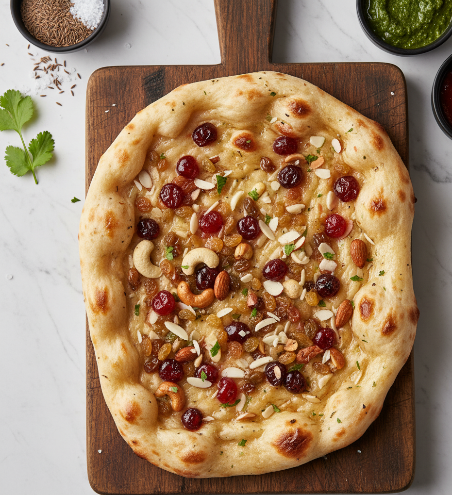 Experience the enchanting sweet and savory balance of our Buttered Kashmiri Naan – a truly unique and aromatic Indian bread that tantalizes the senses!